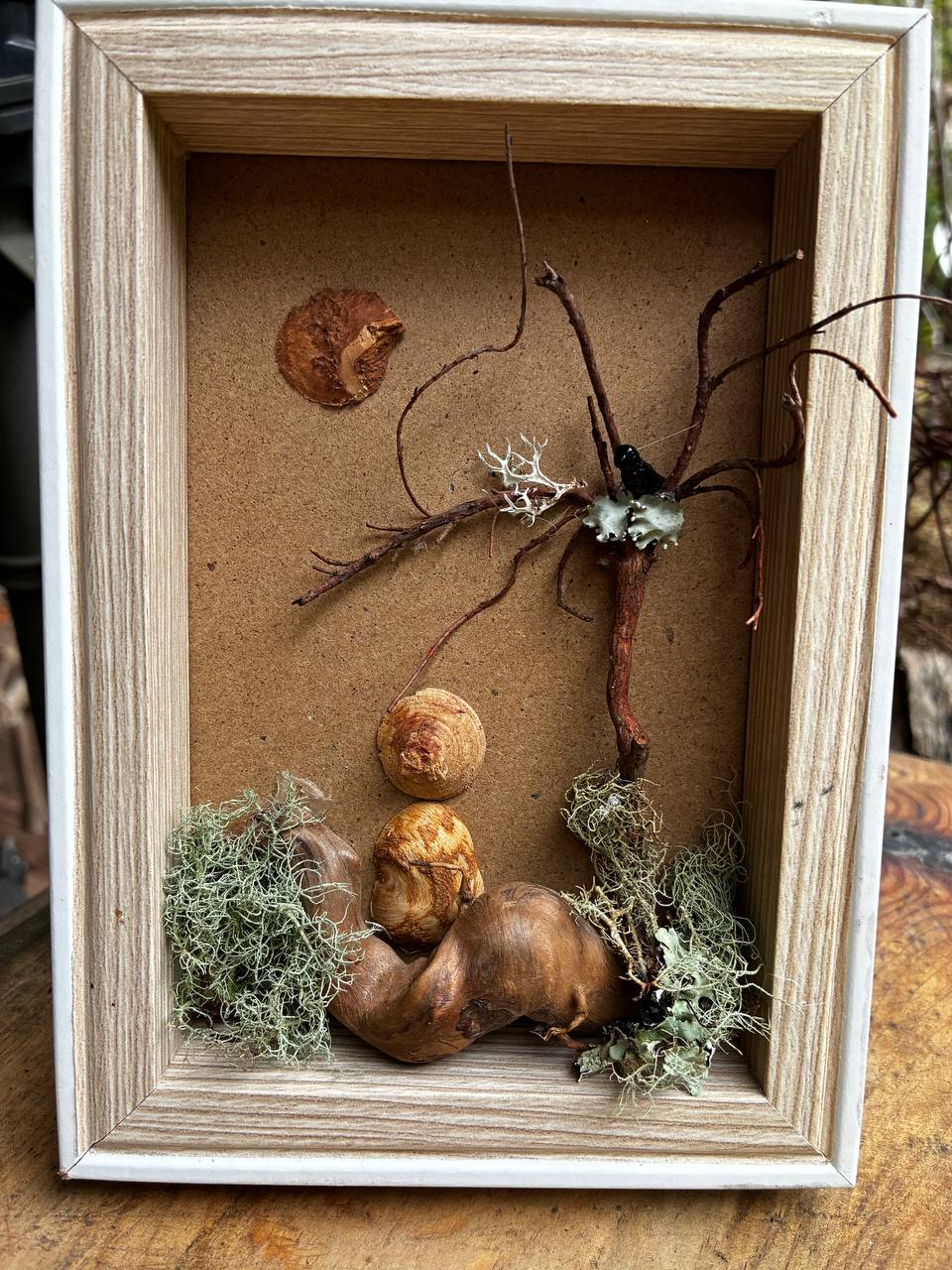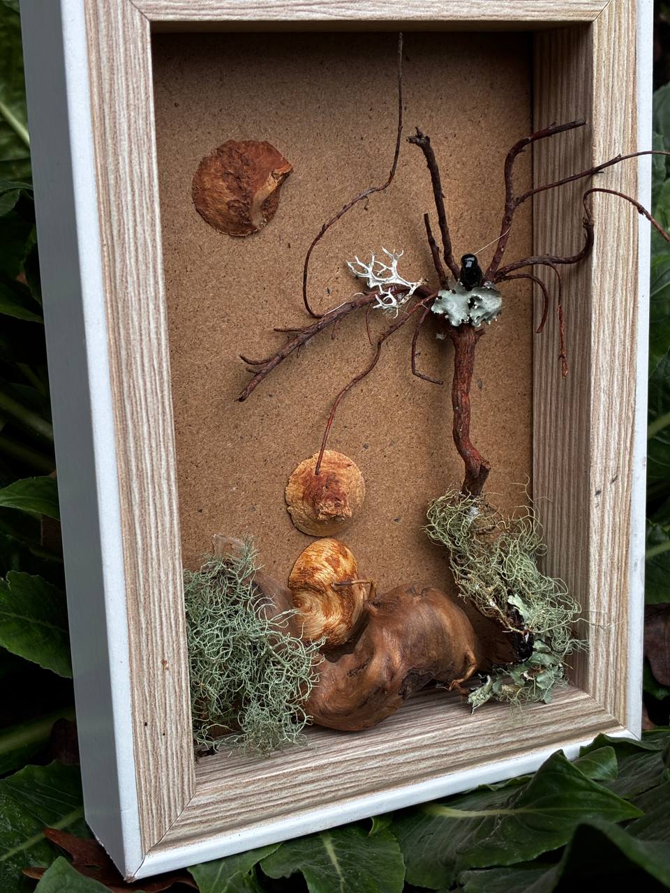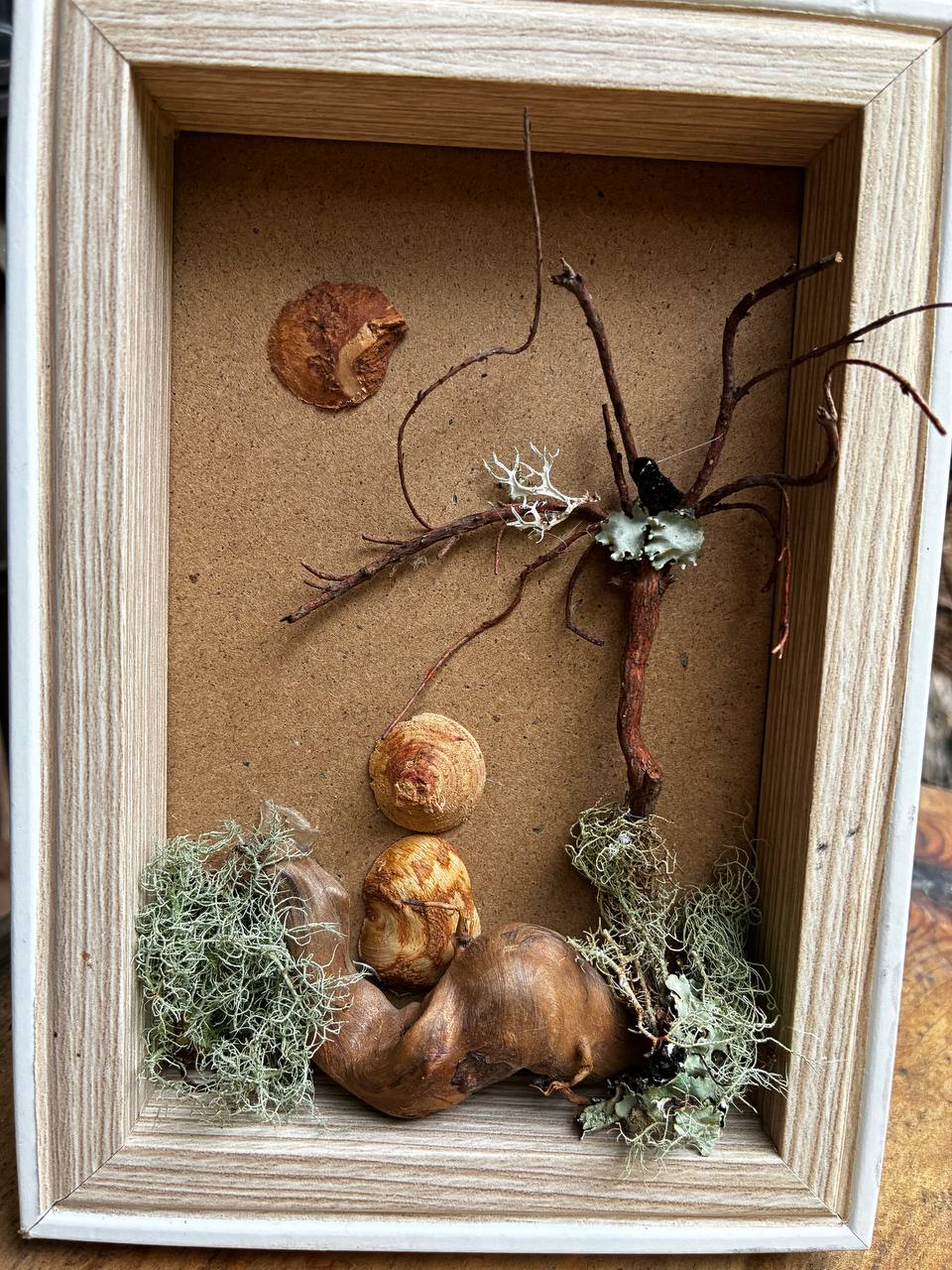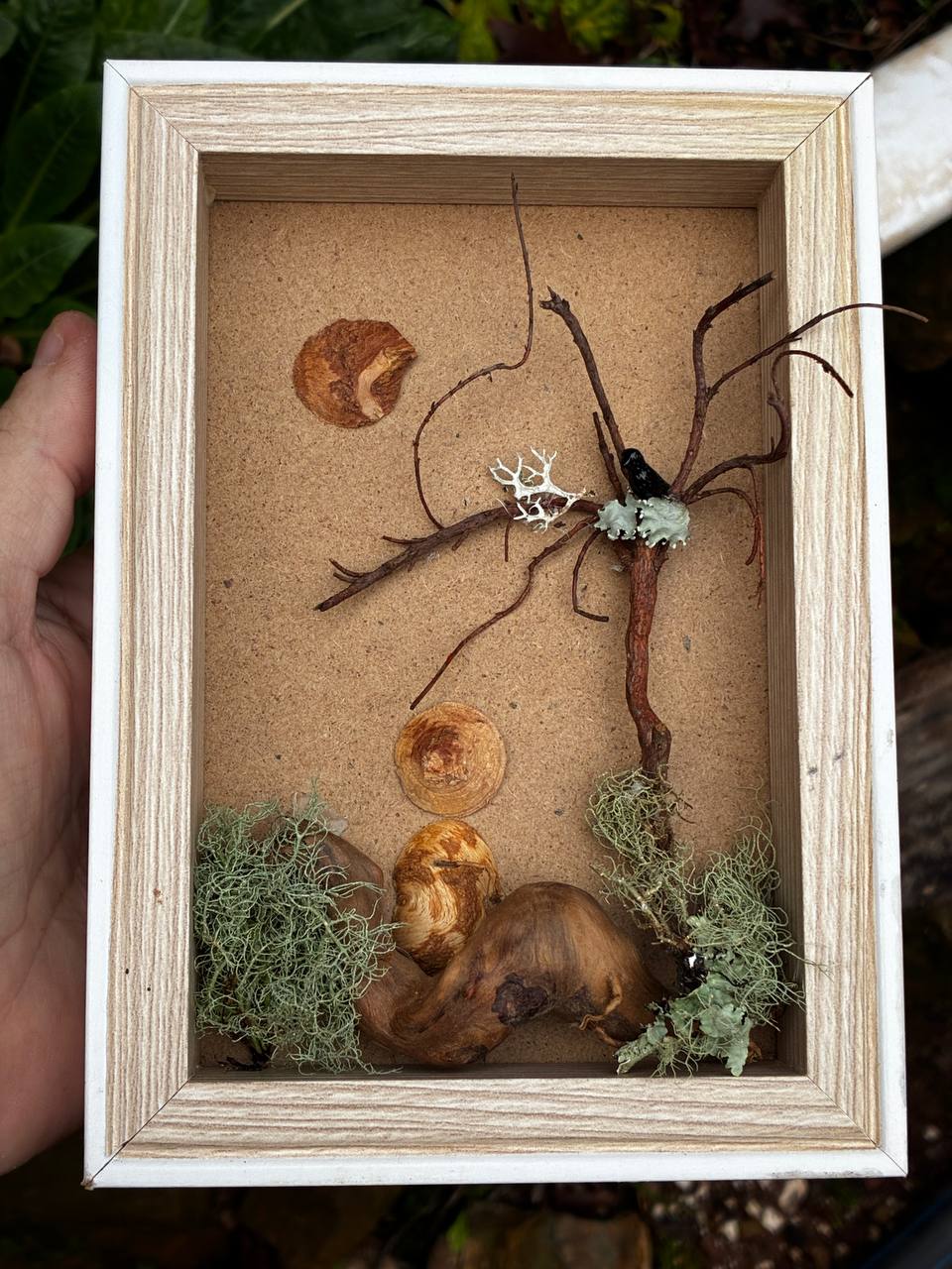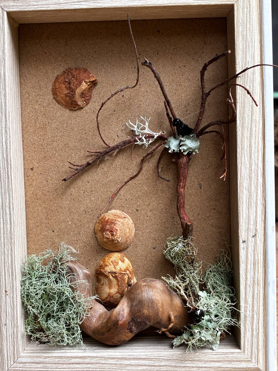 Ein verzweigtes Ästchen mit feiner Flechte dient als Baum und verleiht dem Bild Bewegung und Charakter. Zartes Moos und ein geschwungenes Stück Wurzelholz bilden eine natürliche Basis, die dem Arrangement Tiefe und Erdung gibt. Der helle Holzrahmen fasst alles harmonisch zusammen und lässt die Naturmaterialien besonders gut zur Geltung kommen.