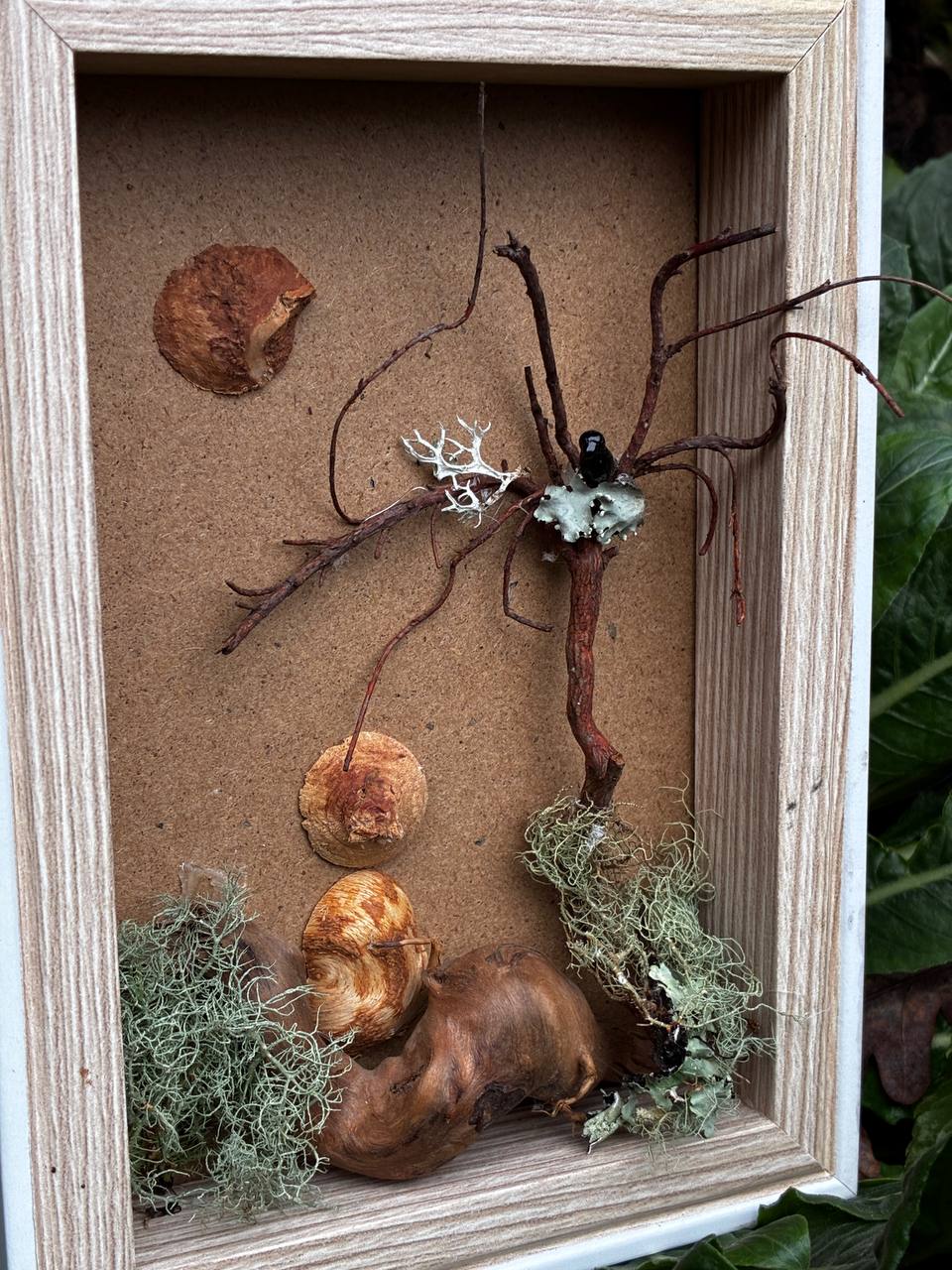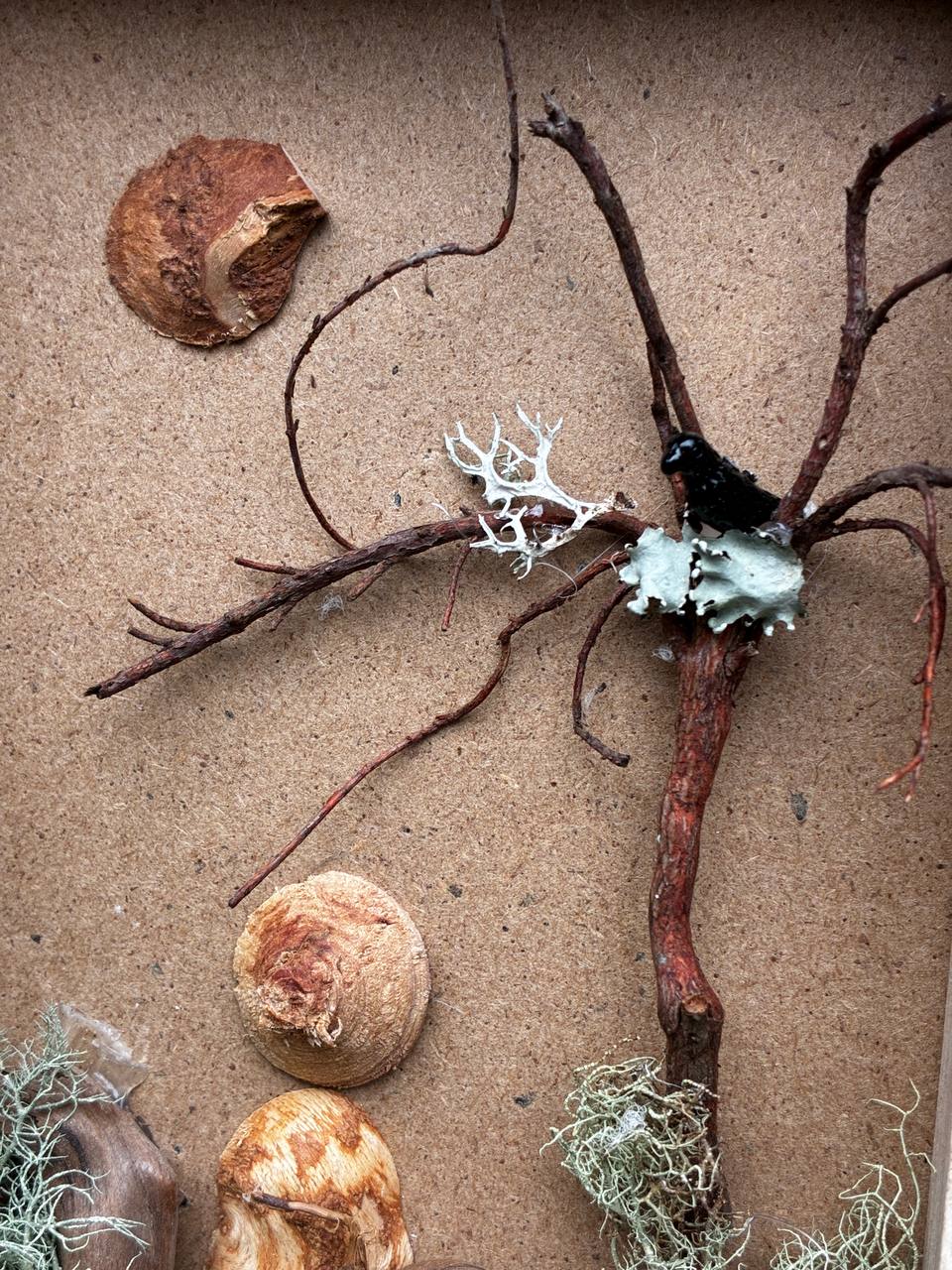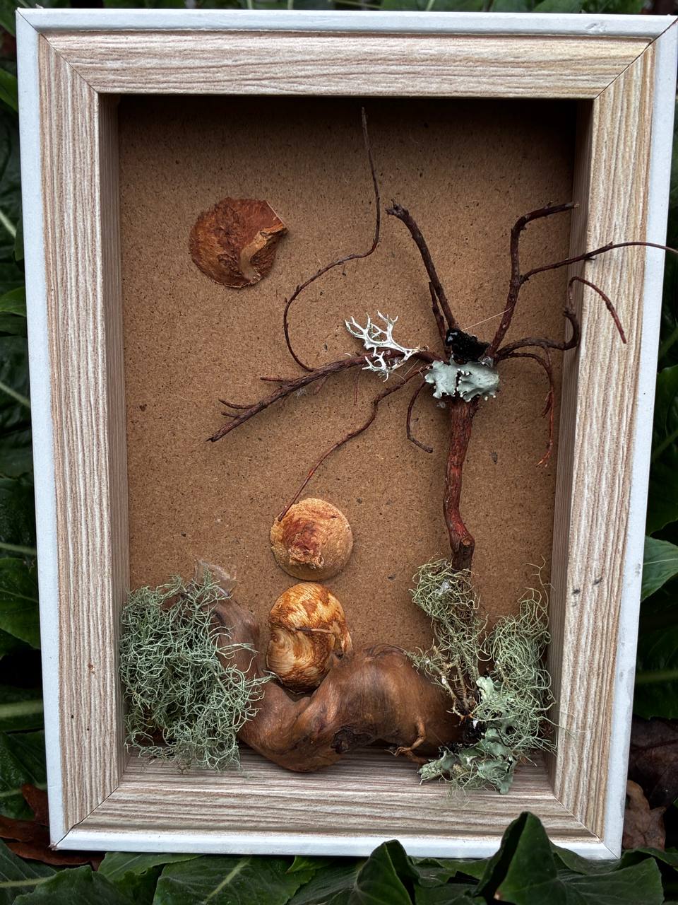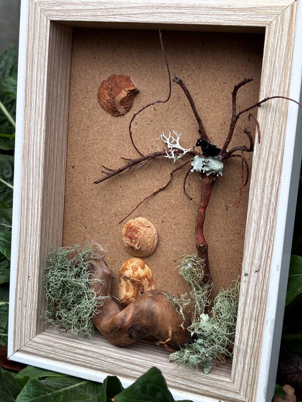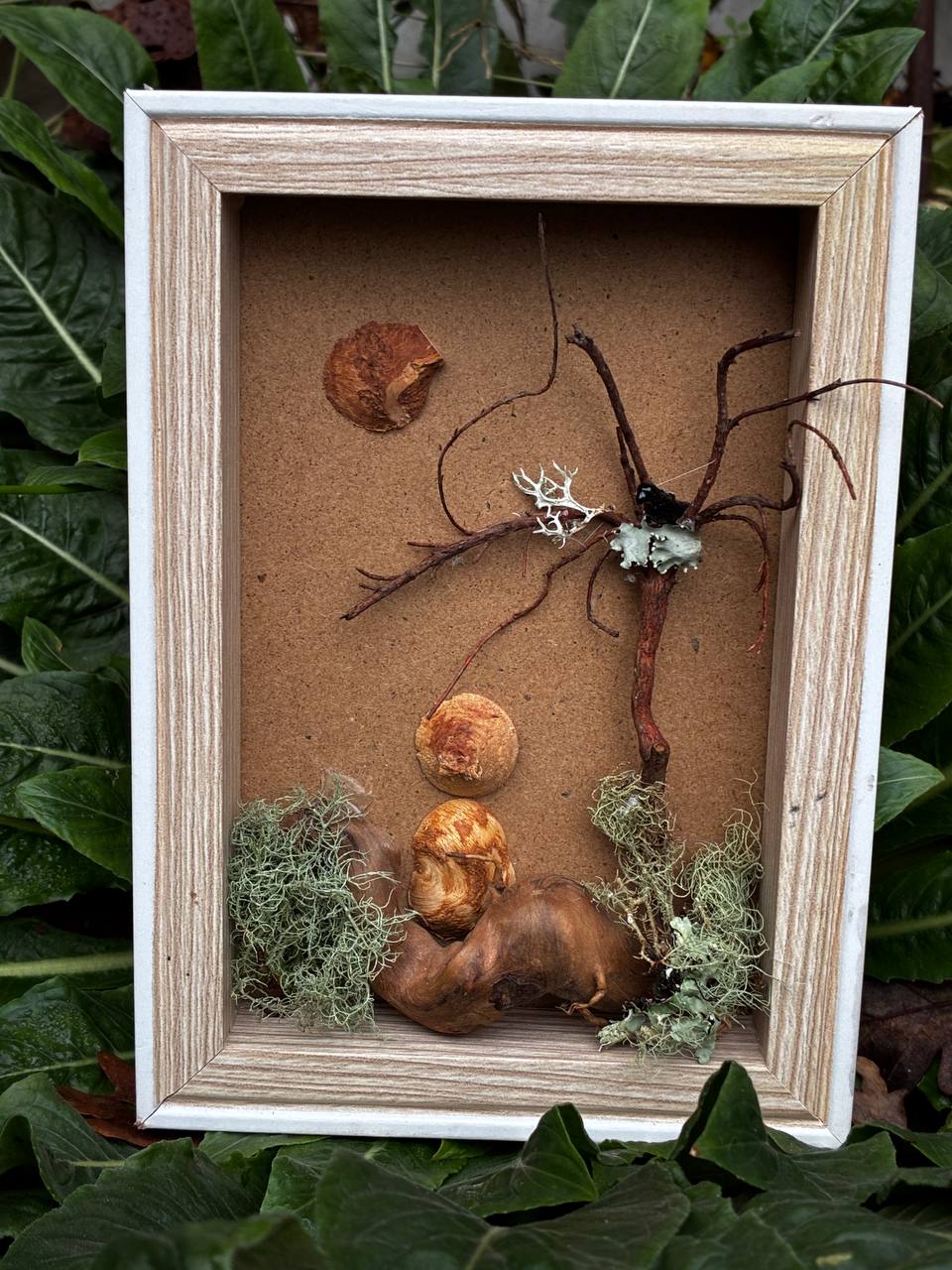 Ein verzweigtes Ästchen mit feiner Flechte dient als Baum und verleiht dem Bild Bewegung und Charakter. Zartes Moos und ein geschwungenes Stück Wurzelholz bilden eine natürliche Basis, die dem Arrangement Tiefe und Erdung gibt. Der helle Holzrahmen fasst alles harmonisch zusammen und lässt die Naturmaterialien besonders gut zur Geltung kommen.