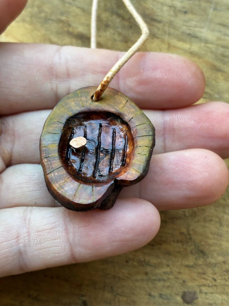 Dieser handgefertigte Kettenanhänger in Form einer Hobbittür, gefertigt aus einer Baumperle, ist ein kleines Stück Naturmagie zum Tragen.
