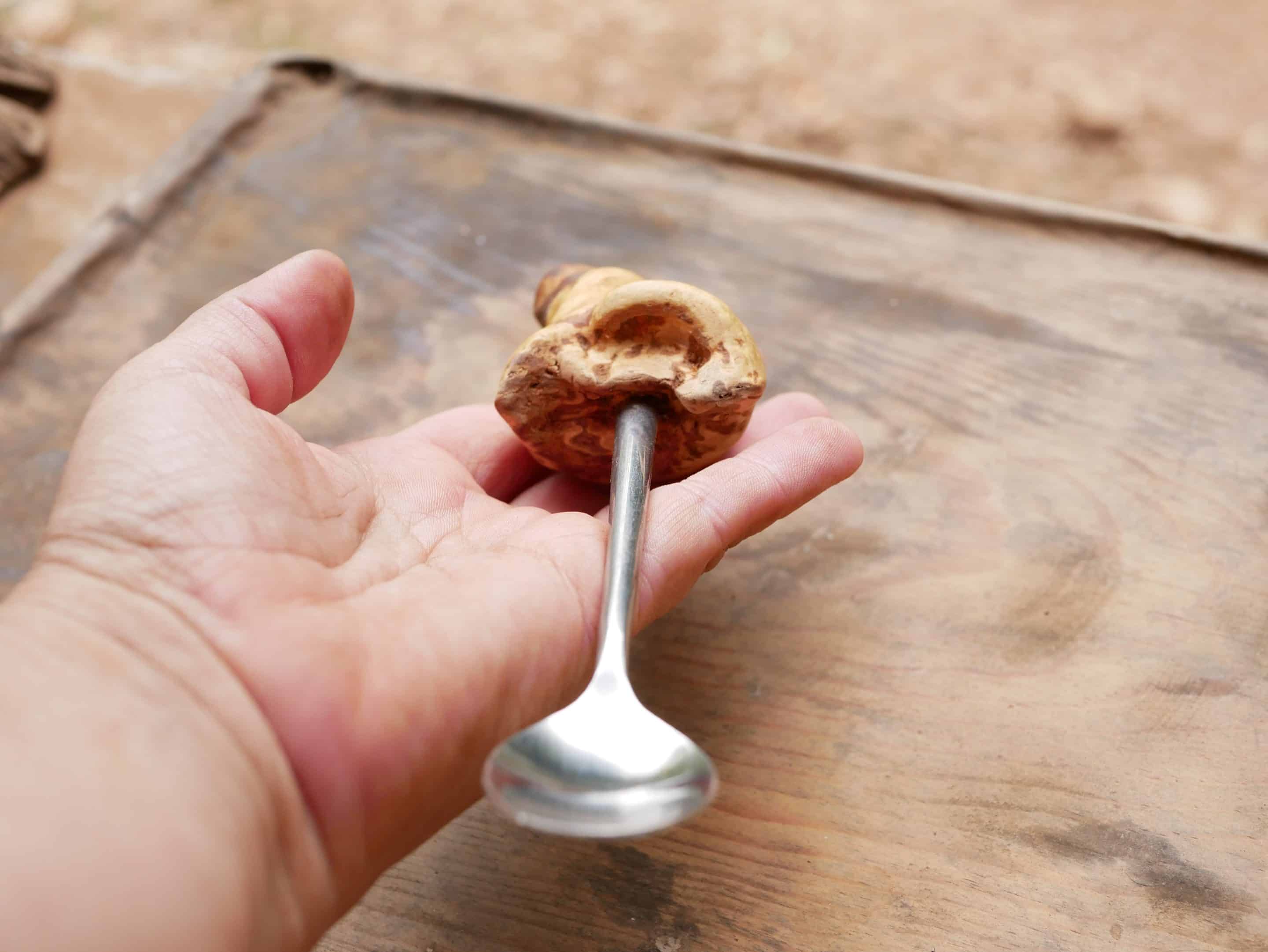 Durch die Baumperle wird jeder Löffel zu einem echten Unikat, das die Geschichte des Waldes in sich trägt.