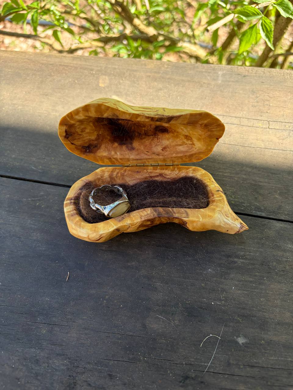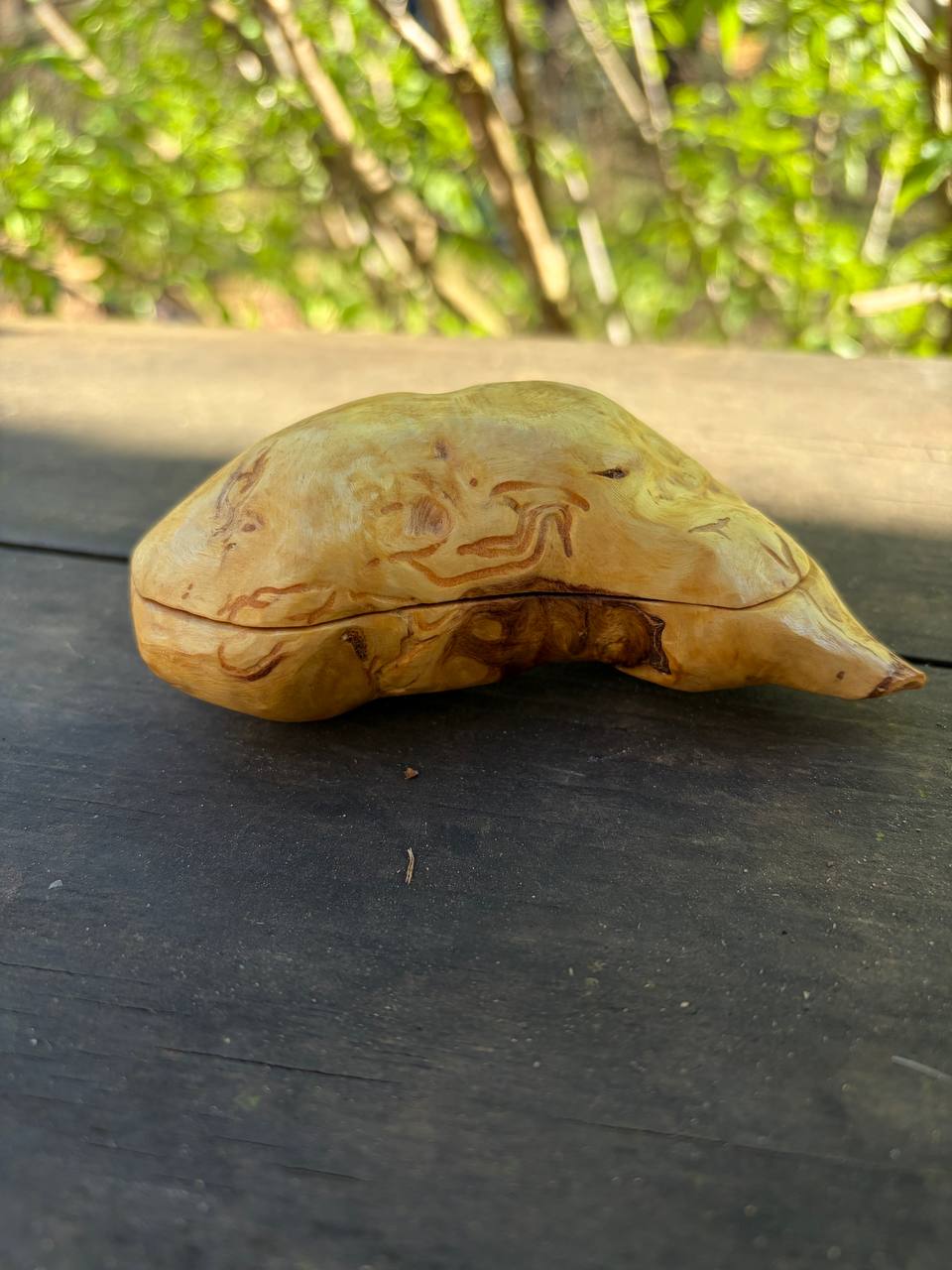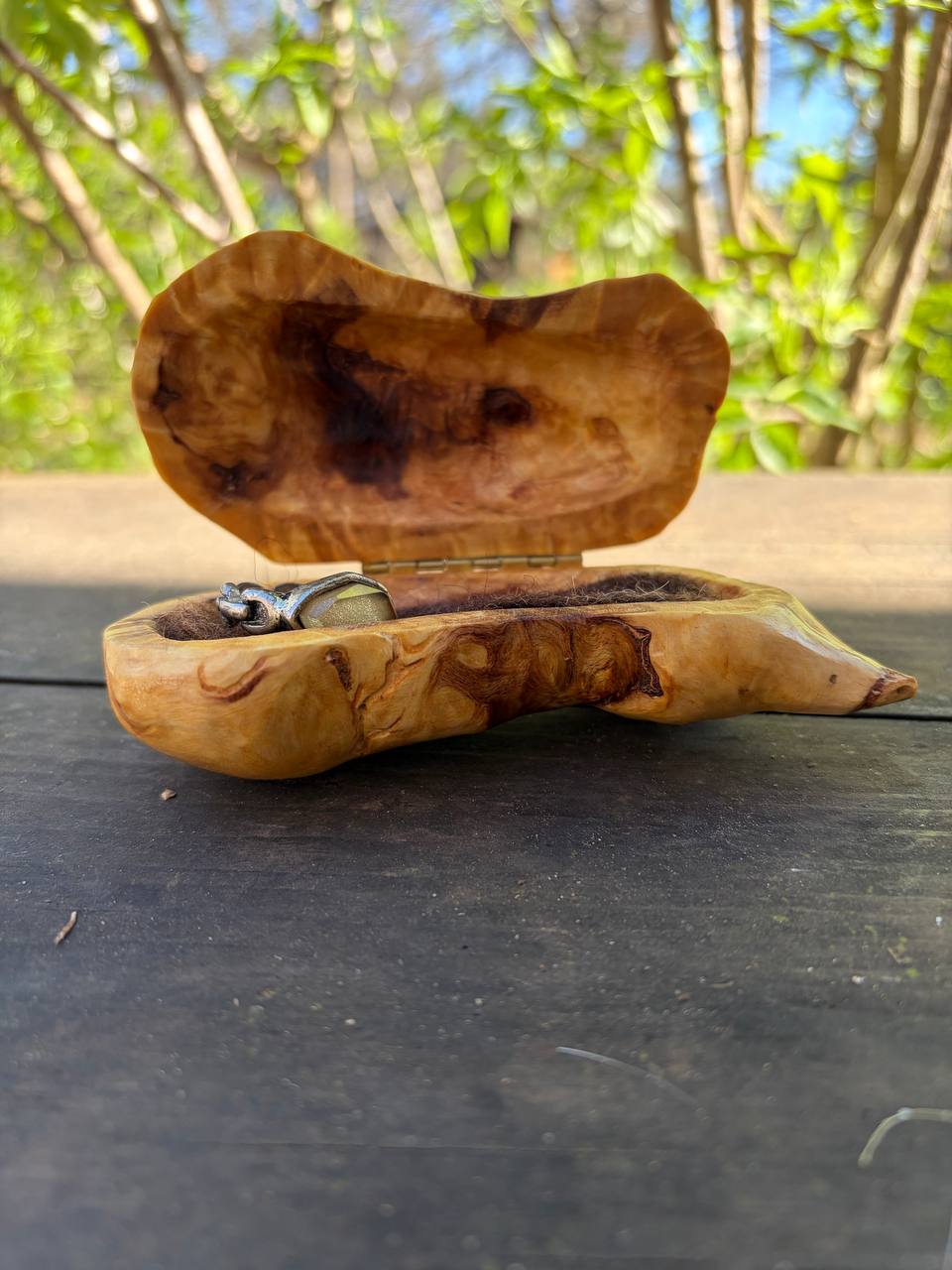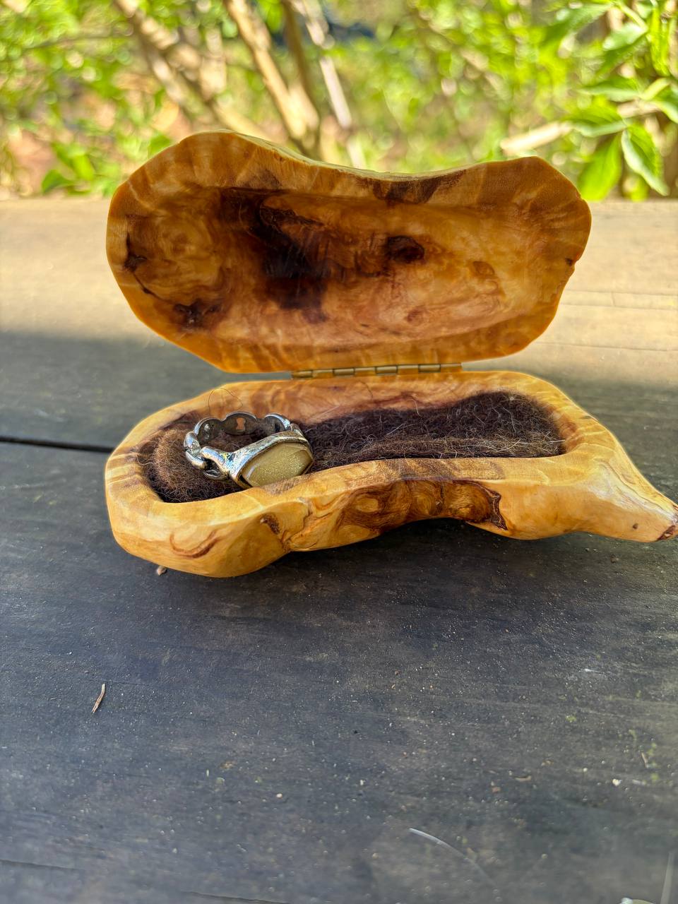 Diese außergewöhnliche Schatulle ist aus einer Baumperle gefertigt – einer seltenen Wuchsform, die ein Baum über viele Jahre hinweg bildet. Jede Baumperle erzählt ihre eigene Geschichte und macht diese Schatulle zu einem unverwechselbaren Unikat.