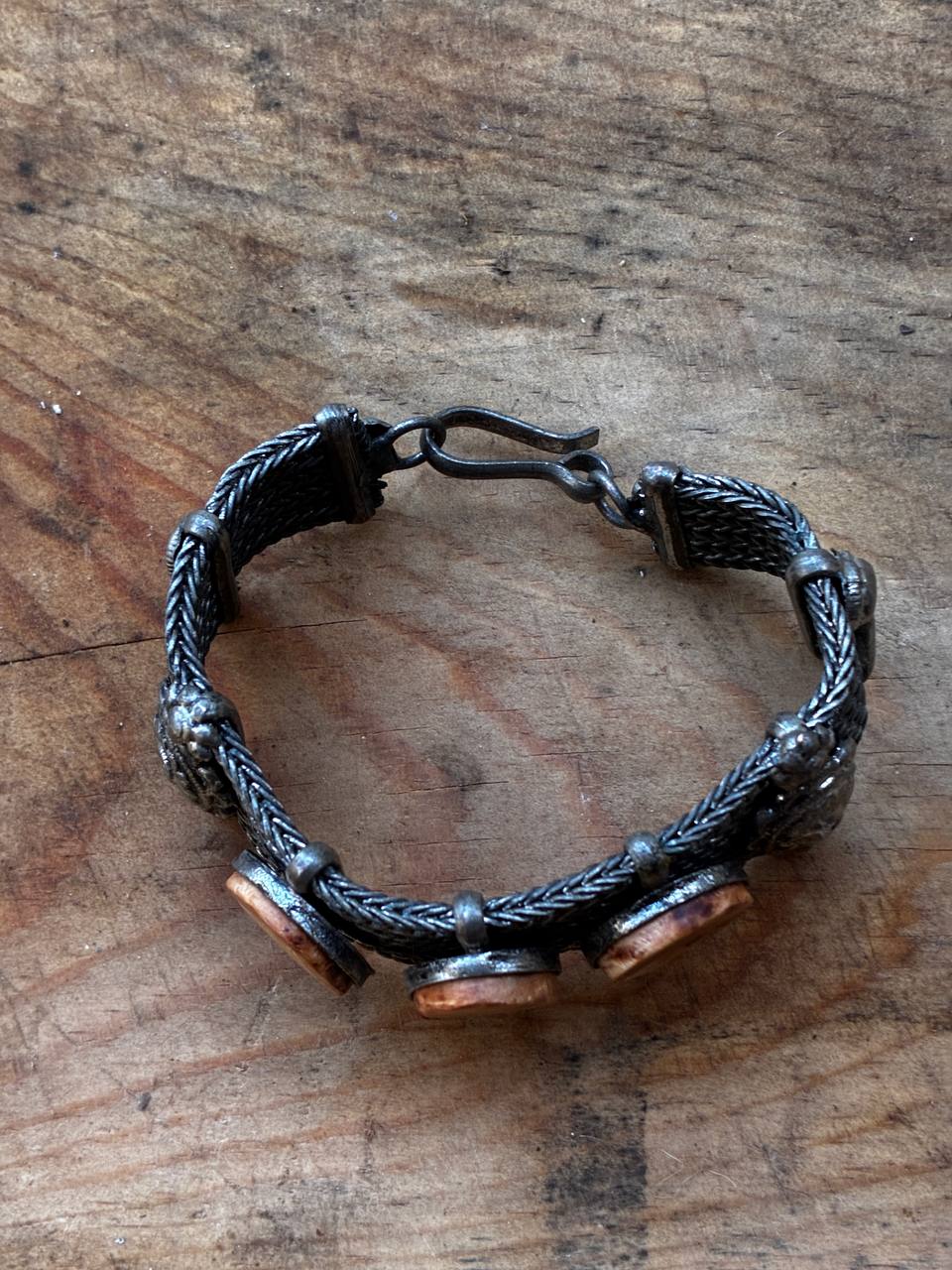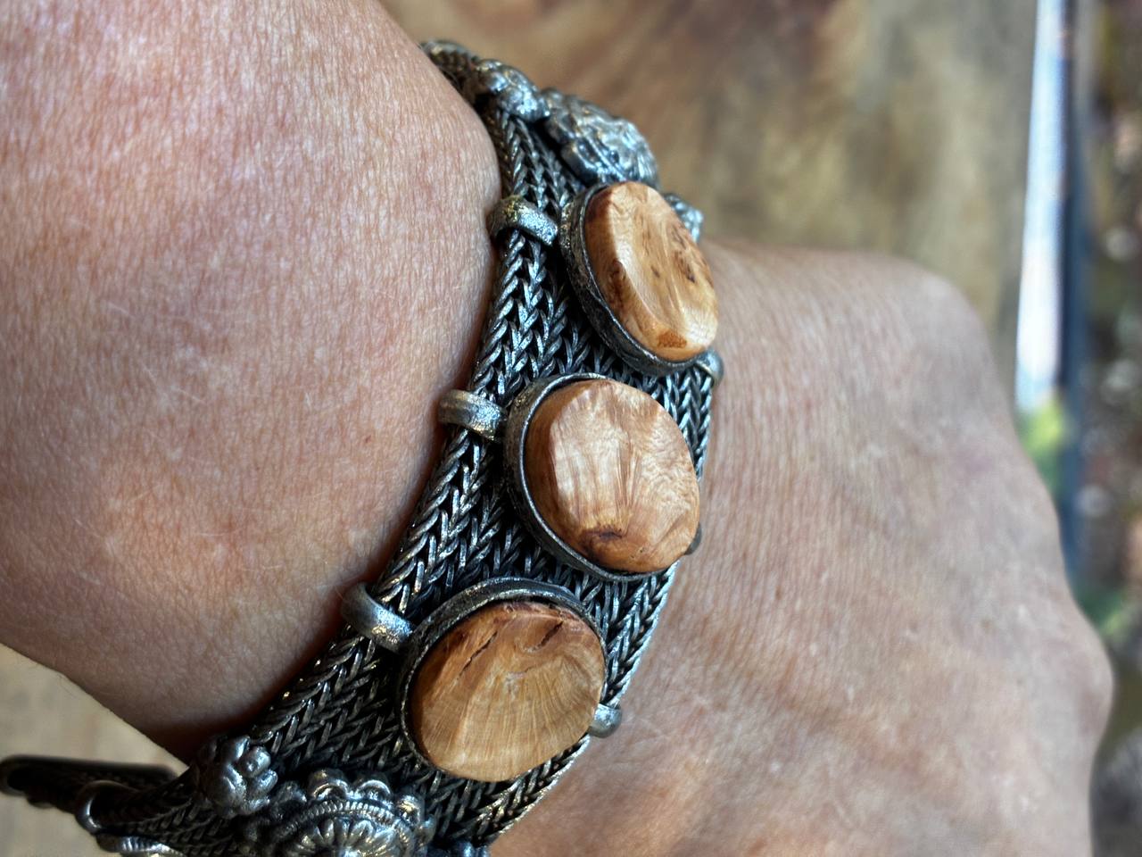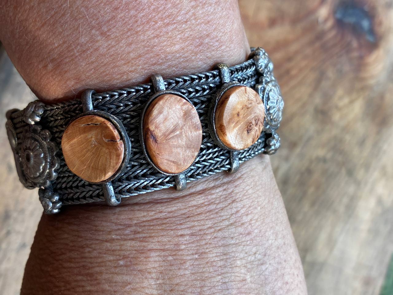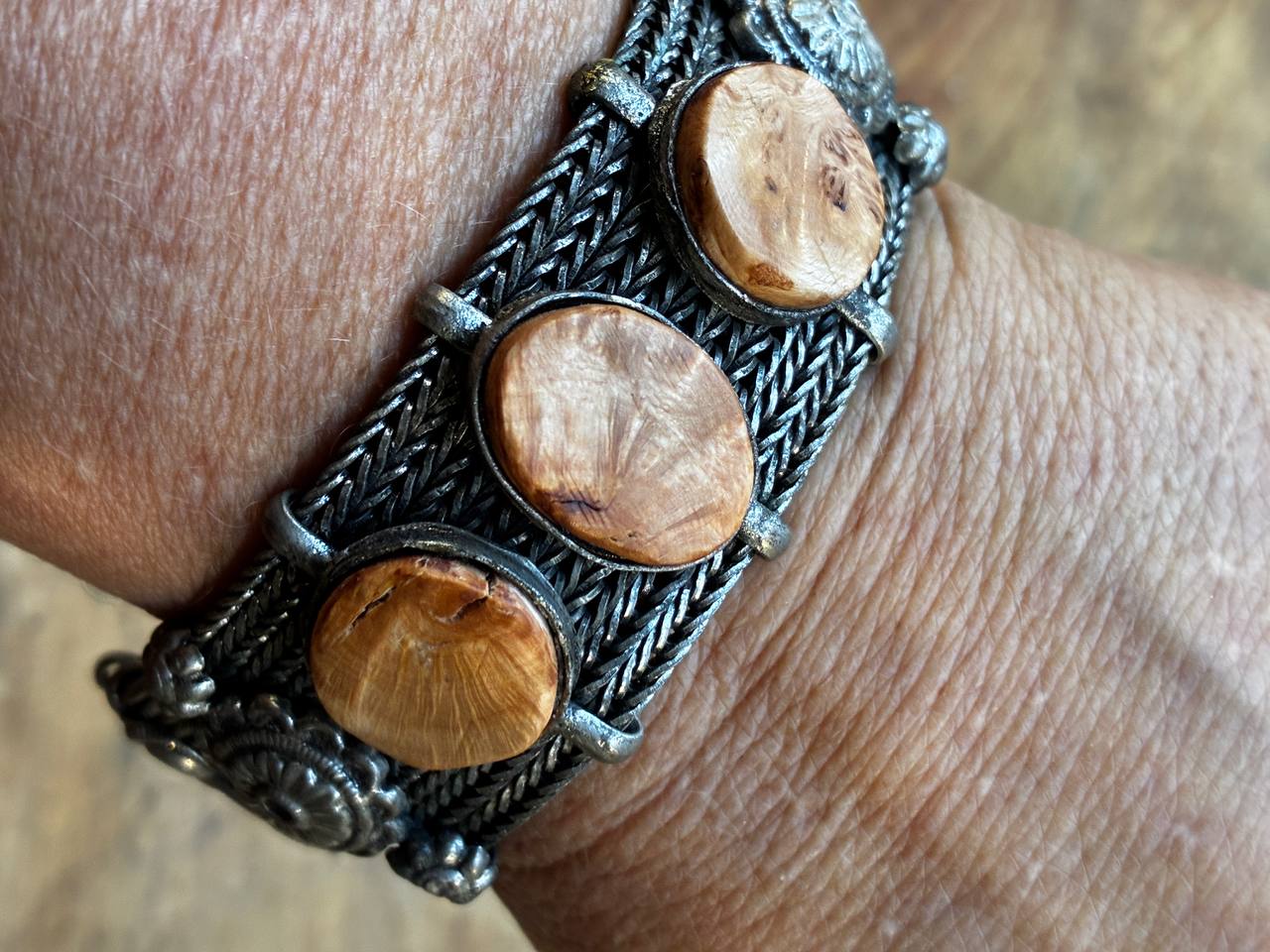 Das Armband selbst besitzt eine detailreiche, metallene Gliederstruktur, deren Ornamentik an historische Handwerkskunst erinnert. Die sanft schimmernden Baumperlen bilden einen warmen Kontrast zum kühlen Metall – ein Zusammenspiel zwischen Natur und Vergangenheit, zwischen Fundstück und Handarbeit.