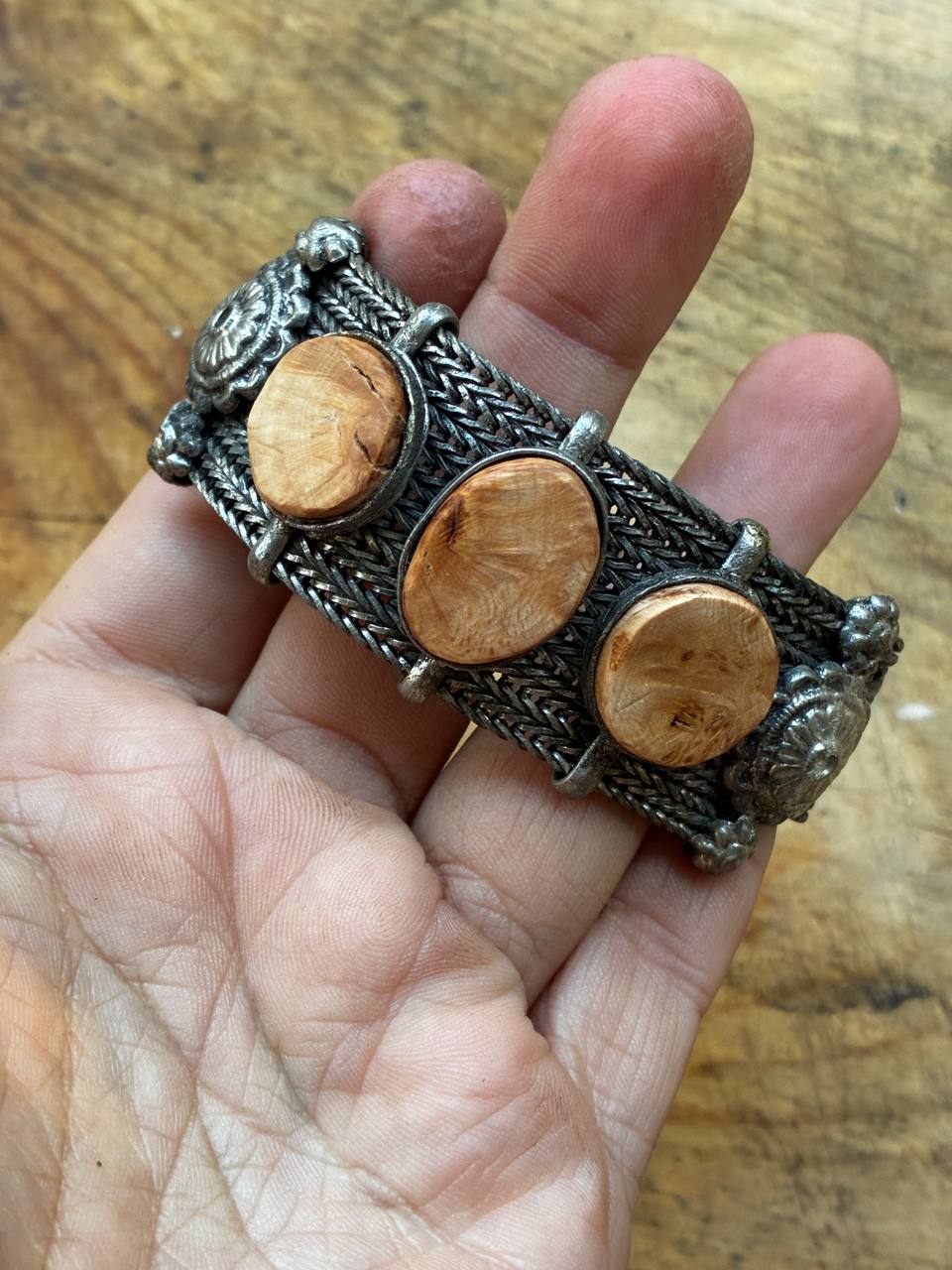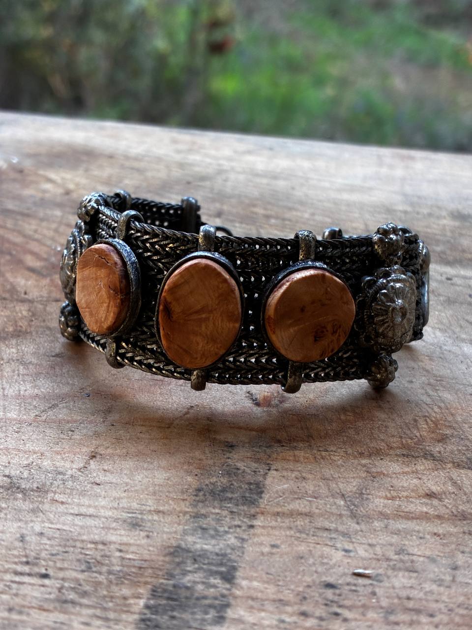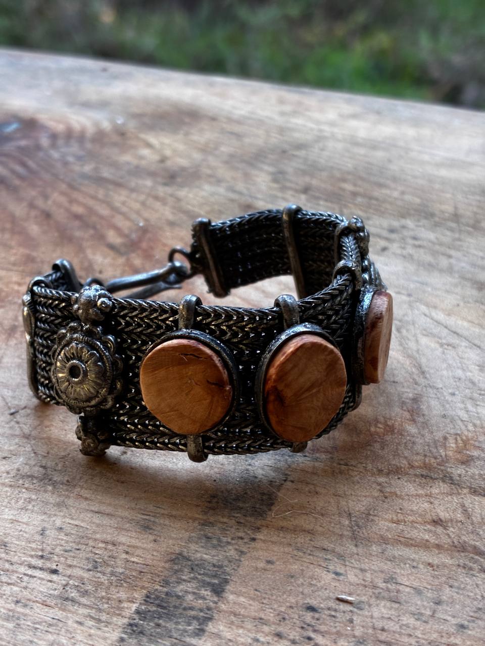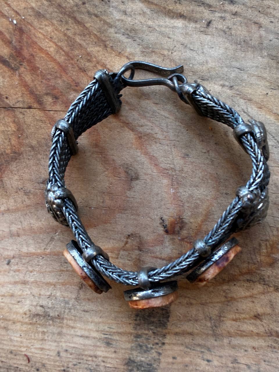 Das Armband selbst besitzt eine detailreiche, metallene Gliederstruktur, deren Ornamentik an historische Handwerkskunst erinnert. Die sanft schimmernden Baumperlen bilden einen warmen Kontrast zum kühlen Metall – ein Zusammenspiel zwischen Natur und Vergangenheit, zwischen Fundstück und Handarbeit.